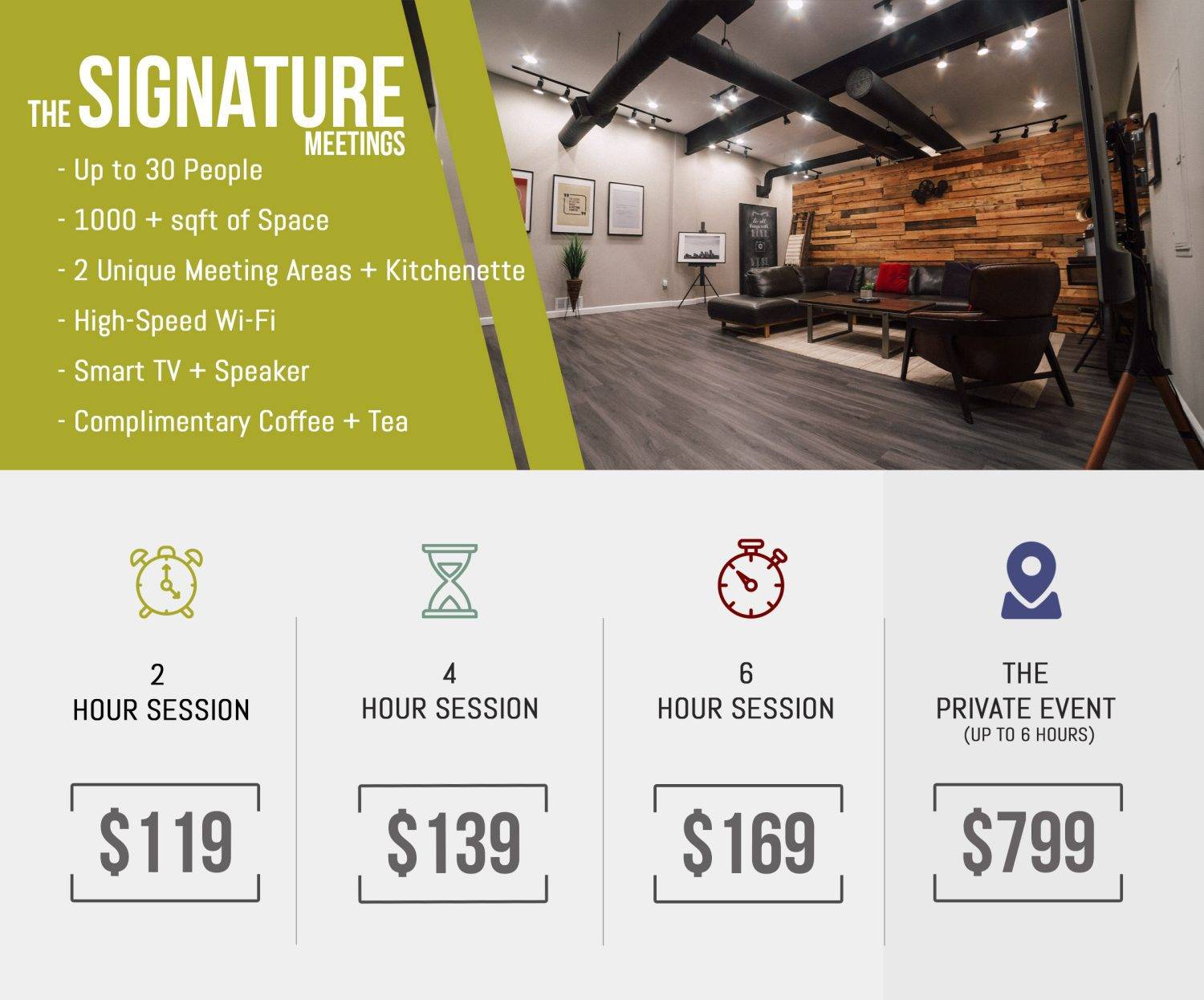 The meeting session is your typical business meeting between you and your colleagues that does not require moving a substantial amount of furniture around or setting up cameras and lights. This session is geared towards professionals who need a meeting space to meet and share ideas.